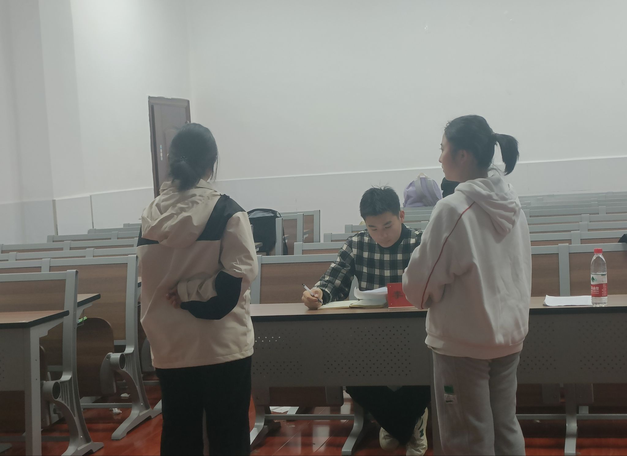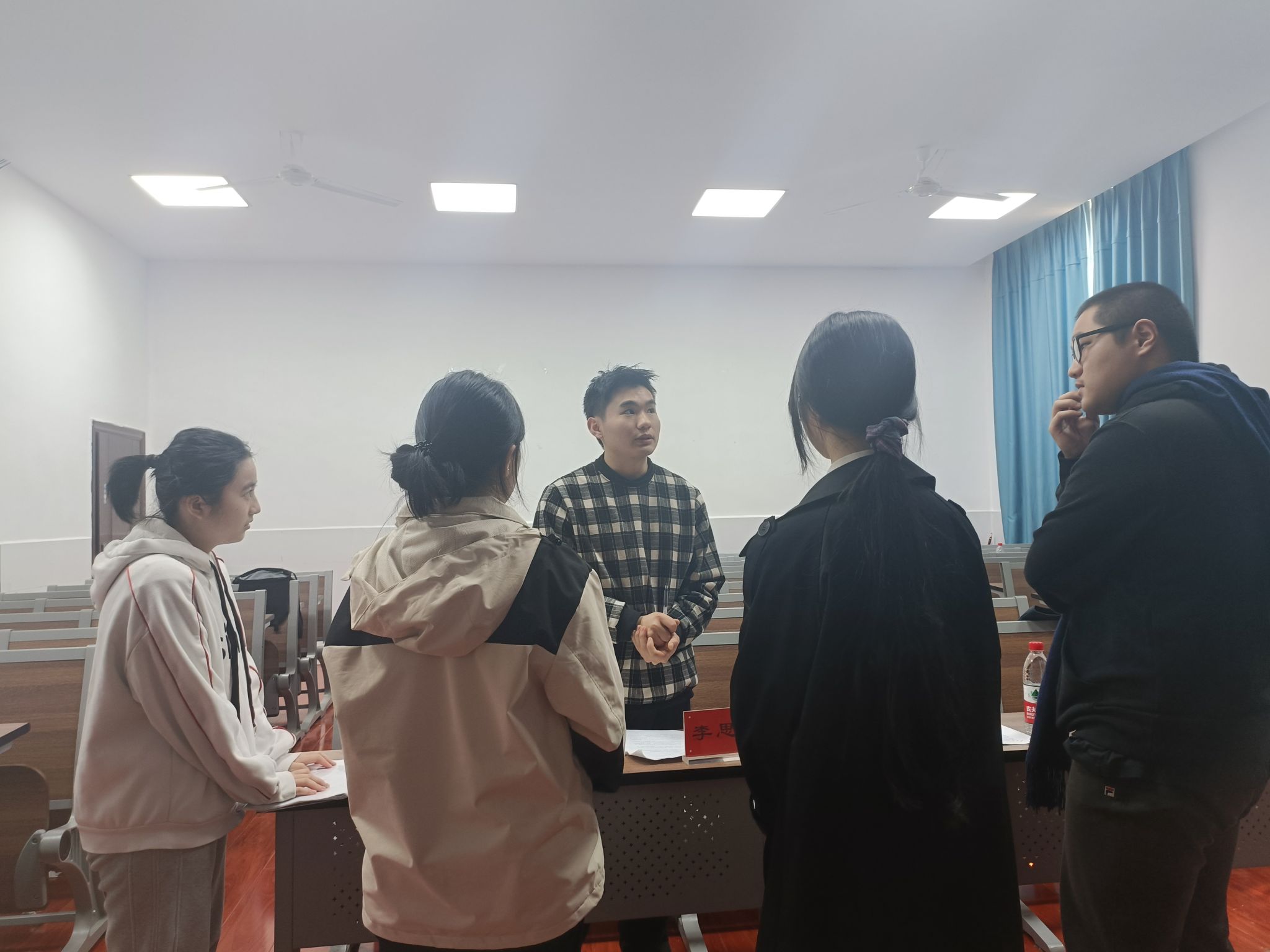 李思文来到排练教室,首先观看了《芝兰玉碎》节选片段的表演。他对演员们的台词、动作、神态的细节把握表示了肯定,赞扬了演员们的表演功底和剧组的辛勤付出,同时也指出了《芝兰玉碎》剧本上存在的不足,并对后续演出形式的进步提出了宝贵的指导意见。李思文了解到了23级演员在时间上的困难并表示理解,在这之后,导演向他汇报了《芝兰玉碎》公演的筹备进度,李思文也分享了他对剧本内容的理解,导演们表示受益匪浅。