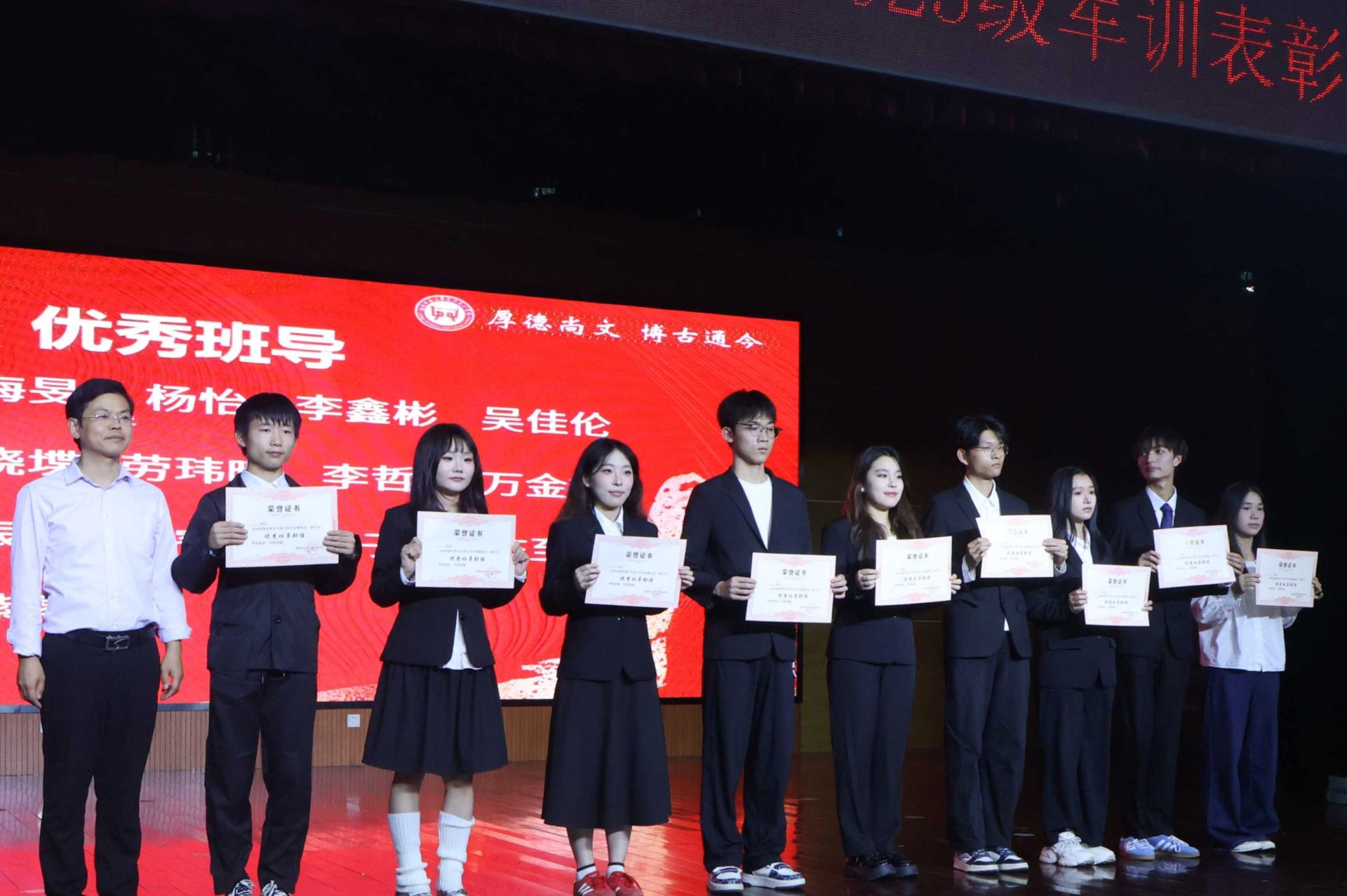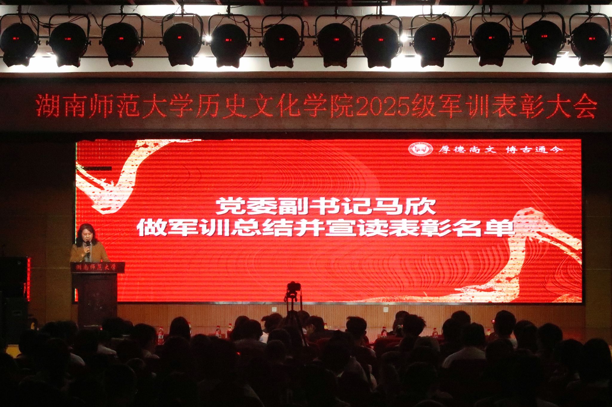 马欣代表公司作军训总结与表彰报告。她系统回顾了为期14天的军训历程,充分肯定了历文学子所取得的优异成绩,并对军训期间涌现的先进集体予以表彰。她强调,希望全体新生能将军训中锤炼的意志品质与优良作风延续到今后的学习生活中,砥砺前行,不负韶华。讲话结束后,马欣宣读了军训先进个人获奖名单,院领导为获奖员工颁奖并合影留念。