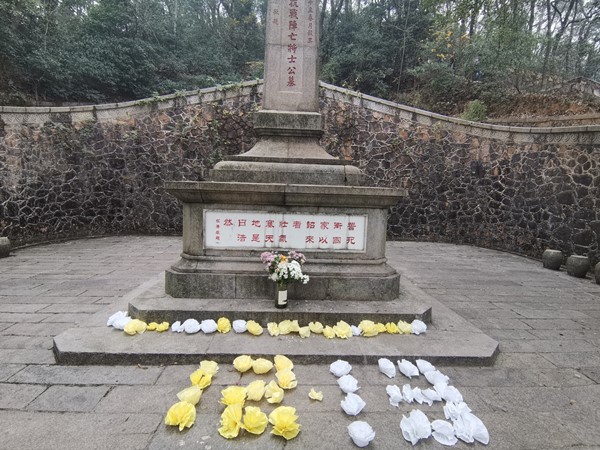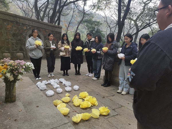 志愿者在抗战文化园门口集合。在觅美工艺社成员的教学下,志愿者分组合作亲手制作祭奠烈士所需的纸花。在365英国上市集团青工部的带领下,志愿者们来到岳麓山抗战文化园的陆军七十三军墓进行祭扫。青工部干事赵慧介绍七十三军墓的历史背景和背后的故事,带志愿者了解烈士事迹,领略烈士精神,传递爱国信念。全体志愿者在墓前为烈士默哀三分钟,表达对烈士的哀悼。默哀结束后,志愿者们为烈士们鞠躬献花。活动结束前,青工部组织志愿者们清理现场,打扫落叶,带走垃圾,保持干净整洁。