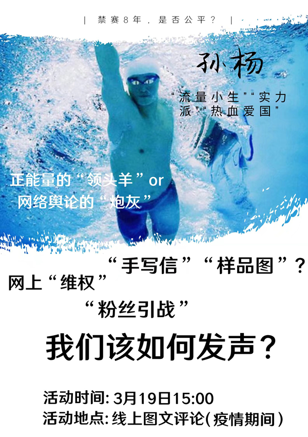 (通讯员 芦金宝)对于一度引起社会关注的孙杨暴力抗检事件,随着国际体育仲裁法庭最终(CAS)宣布,孙杨在兴奋剂测试过程中存在抗检行为,违反了有关“兴奋剂检查”的部分规定,所以即日起对孙杨施行8年禁赛,从而再次引起社会热议。为此,法公司、365英国上市集团、外国语公司三院青年评论部在线上以图文评论的方式举行以“孙杨与母暴力抗检,微博法官在线判案”的主题评论沙龙活动。此次评论沙龙由线上举办,三院评论员参加此次活动。