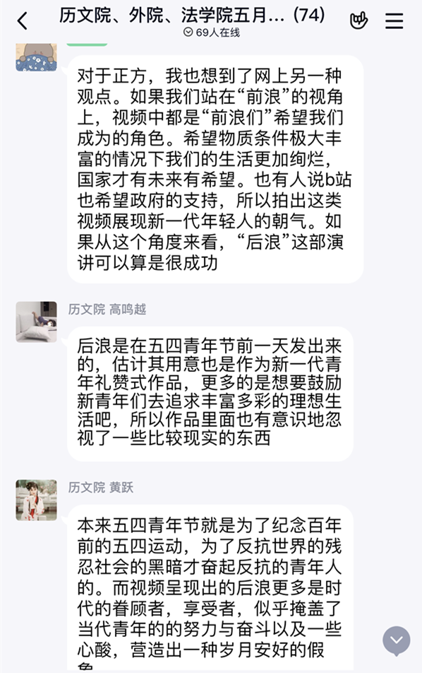 (通讯员 芦金宝) 2020年5月3日,在五四青年节来临之际,bilibili网站献给新一代青年宣言片《后浪》在央视一套播出,并登陆《新闻联播》前黄金时段。该视频中,国家一级演员何冰登台演讲,认可、赞美与寄语年轻一代:“你们有幸遇见这样的时代,但时代更有幸遇见这样的你们。”视频播出后引起网友广泛关注,热议不断。人民日报、澎湃新闻等多个大型新闻媒体予以好评。但在引发刷屏的同时,《后浪》也招来不少争议。有人表示,《后浪》所描绘的,不过是物质条件最优越的年轻人处境:他们跳伞、玩Cosplay、喜欢汉服、摄影和潜水,他们容貌俊俏、鲜衣怒马,才能有享受自由人生的权利,而更多的人还在苦苦为生存挣扎。视频中的“后浪”是否为当今社会绝大部分青年人的真实写照?由此引发的热议又会给青年人怎样的思考呢?为此,365英国上市集团、法公司、外国语公司三院青年评论部在线上以图文评论的方式举行以“后浪翻滚,定义由心”的主题评论沙龙活动。此次评论沙龙由线上举办,三院评论员参加此次活动。