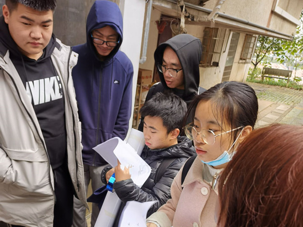 在活动开始前,美术公司员工冯仟豪对志愿者们进行了培训。他耐心地解释了设计图纸上各类图案的尺寸与比例,强调了志愿者们在活动进行中所要注意的一些事项,并对活动中所需要使用的工具做出了详细的说明。在熟悉了设计图纸上各装饰物的尺寸和比例后,志愿者们着手进行楼道的装饰。在冯仟豪的指导下,志愿者们分为两组,一组负责楼道内墙壁宽度及高度的测量,并标记定位点;另一组负责用胶带在墙壁上粘贴出设计好的图案,并对图案进行修饰。在活动开展的过程中,志愿者们也遇到了一些困难。例如定位点不够准确,使得线条在粘贴过程中错位,导致图案比例不够协调;不能熟练地使用美工刀,导致切口无法很好衔接,影响了图案整体的美观度,等等。即使面对如此多的挑战,志愿者们仍然没有放弃,而是积极寻找方法来解决问题。最终,在志愿者们的不懈努下,原本单调的楼道变得丰富、多彩,而志愿者们的劳动成果也得到了居民们的赞赏。
