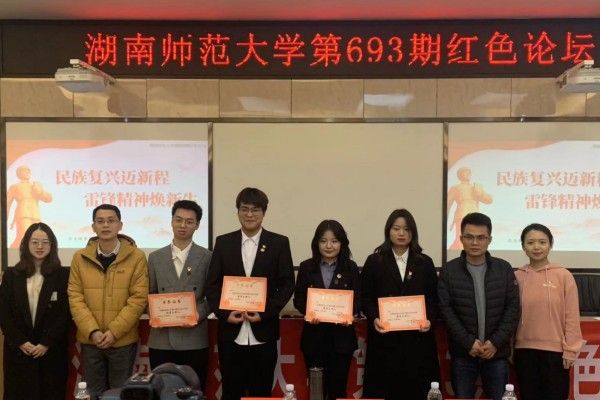论坛伊始,全场肃立,齐唱国歌。陈卓君围绕此次论坛的主题“民族复兴迈新程,雷锋精神焕新生”致辞。主讲人讲述环节,2020级历史基地班李昊结合当代青年志愿服务精神的具体实践,阐释了雷锋精神历久弥新的关键及其在新时代的传承;2021级历史教育班谢锦明以“重铸雷锋精神,迈向复兴新时代”为题,解读了时代浪潮下雷锋精神不断拓展的新内涵。中场环节,与会成员共同欣赏由历文员工演绎的节目《以你之名,砥砺前行》,倾听雷锋与新时代青年之间跨越时空的“对话”。2021级文化产业管理班白义婧从创新宣传的角度出发,提出融合新媒体思维以弘扬雷锋精神,拓宽雷锋精神的宣传思路;2020级历史教育班邓丽华通过讲述新时代活雷锋的具体实例,呼吁当代老员工以实际行动书写新时代鲜活的雷锋故事。现场交流环节,四位主讲人详细解答了同学们的问题。邱亚对此次论坛作出点评,在总体上肯定了论坛的举行,同时从内容、结构等方面分别指出四位主讲人发言的亮点与不足。经嘉宾商议与观众投票,评选白义婧为“最佳主讲人”、“最具人气主讲人”,李昊、谢锦明、邓丽华为“优秀主讲人”。邱亚宣布获奖情况,并为主讲人颁奖。全体成员齐唱团歌。唱毕,论坛落下帷幕。