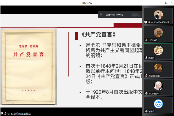 陈卓君以视频形式向同学们展示了《共产主义宣言》的发展历史,并带领同学们共读《共产党宣言》。学员们表示,日常学习过程中将自觉学习《共产党宣言》,深刻领会其精神实质,坚定对马克思主义和社会主义的信仰。随后,学员们分小组学习了马克思列宁主义经典著作,并进行心得体会的分享交流。陈卓君强调,希望同学们将马列主义经典著作中的思想光辉转化为行动上的不竭动力,树立正确的人生观、世界观、价值观,在完成学业的同时将“为人民服务”的精神发扬光大。