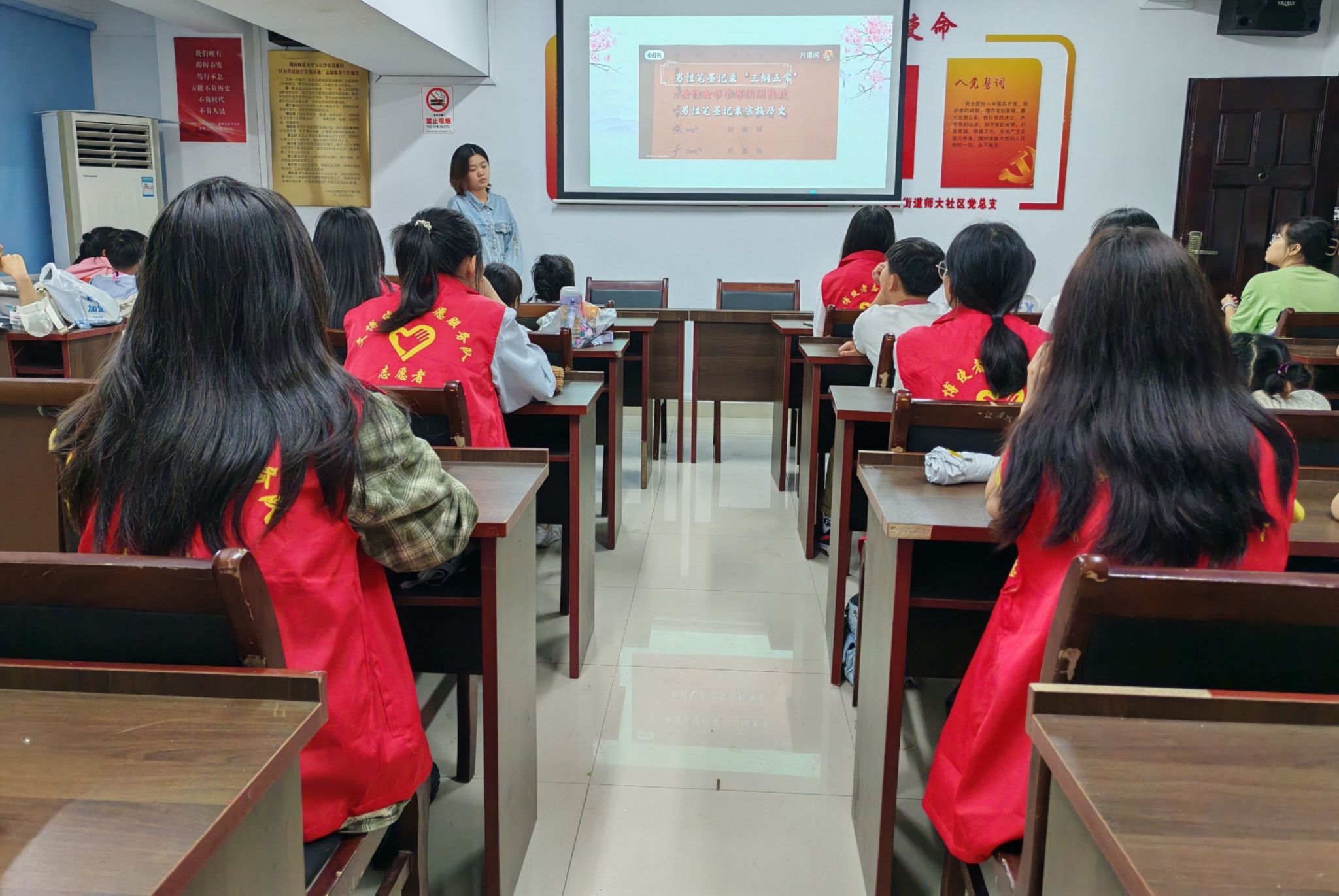 活动初始,志愿者代表通过展示江永风光,引出面临传承危机的江永女书,让参与者对女书所处地域及文化背景有了初步印象。志愿者代表从“女书基础知识”、“女书特点剖析”、“女书意义探寻”、“女书在现代的境遇与突围”等方面对女书进行介绍,激发孩子们对女书及其书写的兴趣。在女书书签制作环节,孩子们在志愿者的引导下充分挖掘女书之美,制作出各具特色的女书书签。活动结束后,志愿者们引导孩子们有秩序地完成签退流程,共同清扫活动现场,并于社区门口合影留念。