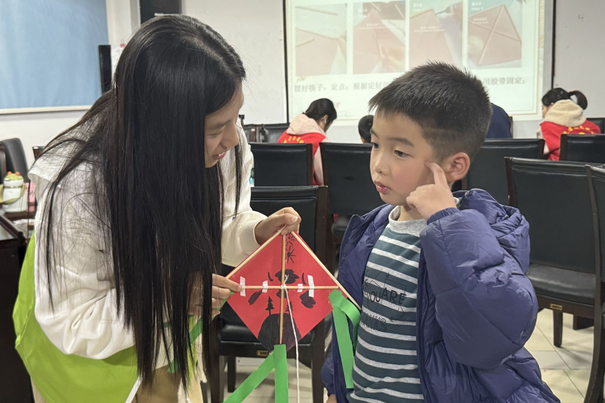 活动伊始,志愿者代表通过谜语竞猜与古诗朗诵,引出纸鸢主题。随后,志愿者代表结合多媒体资料,系统讲解纸鸢的历史演变、形制特点及纹样寓意,重点阐释福寿双全、吉祥如意等传统纹样的文化内涵,加深小朋友们对非遗纸鸢技艺的理解。文化溯源环节,志愿者以马王堆T型帛画中的“飞天”元素与凤鸟云纹为切入点,通过对比丝帛纹样与纸鸢造型,引导小朋友们探索“从丝帛飞鸟到空中纸鸢”的文化演变,体会两种文化在飞翔意象上的共鸣与传承。手工环节中,小朋友们在志愿者的协助下,将马王堆纹样绘于纸鸢表面,创作出各具特色的风筝。制作完成后,小朋友们上台分享创作理念,在实践中深化对传统文化的理解。
