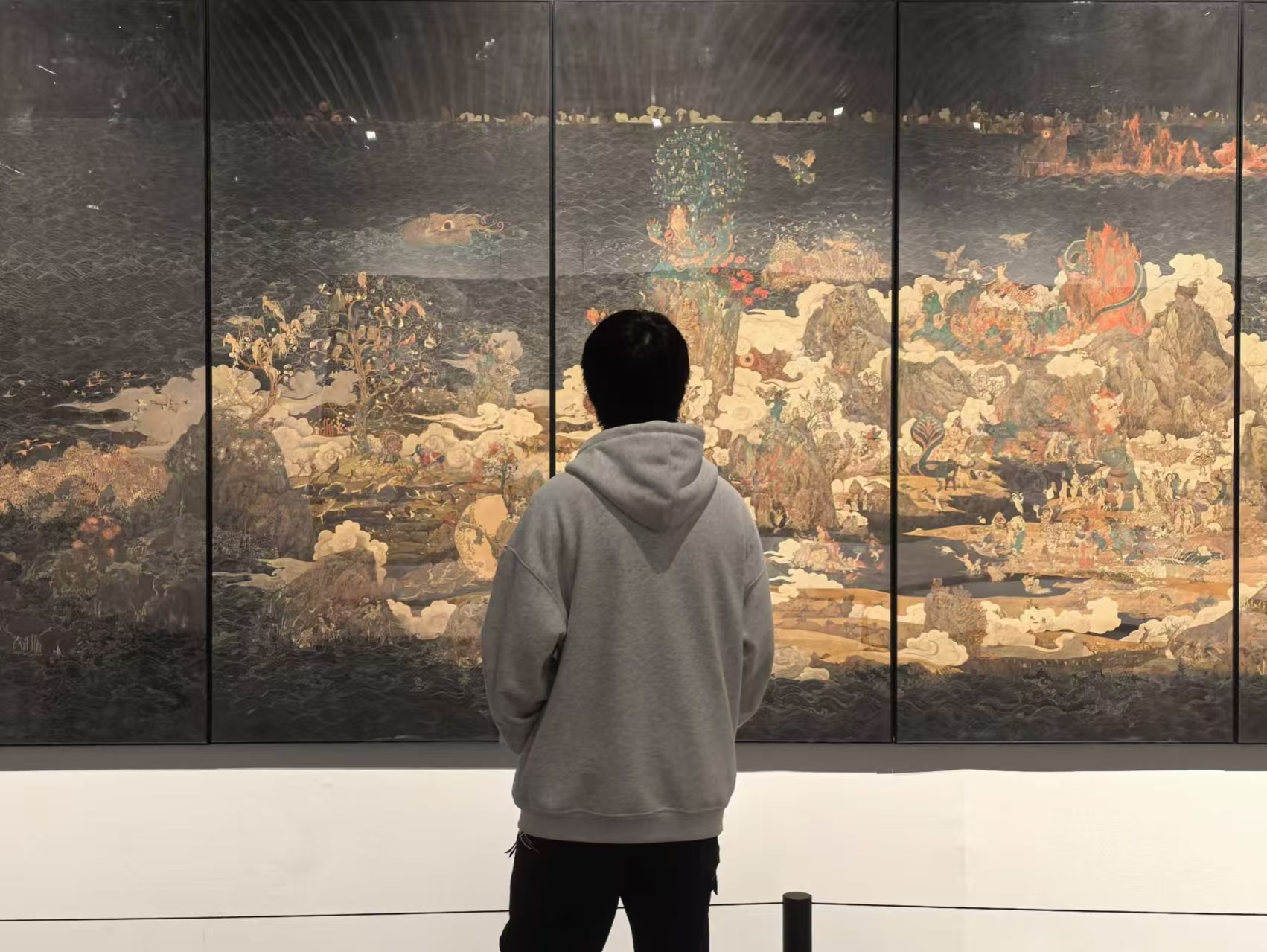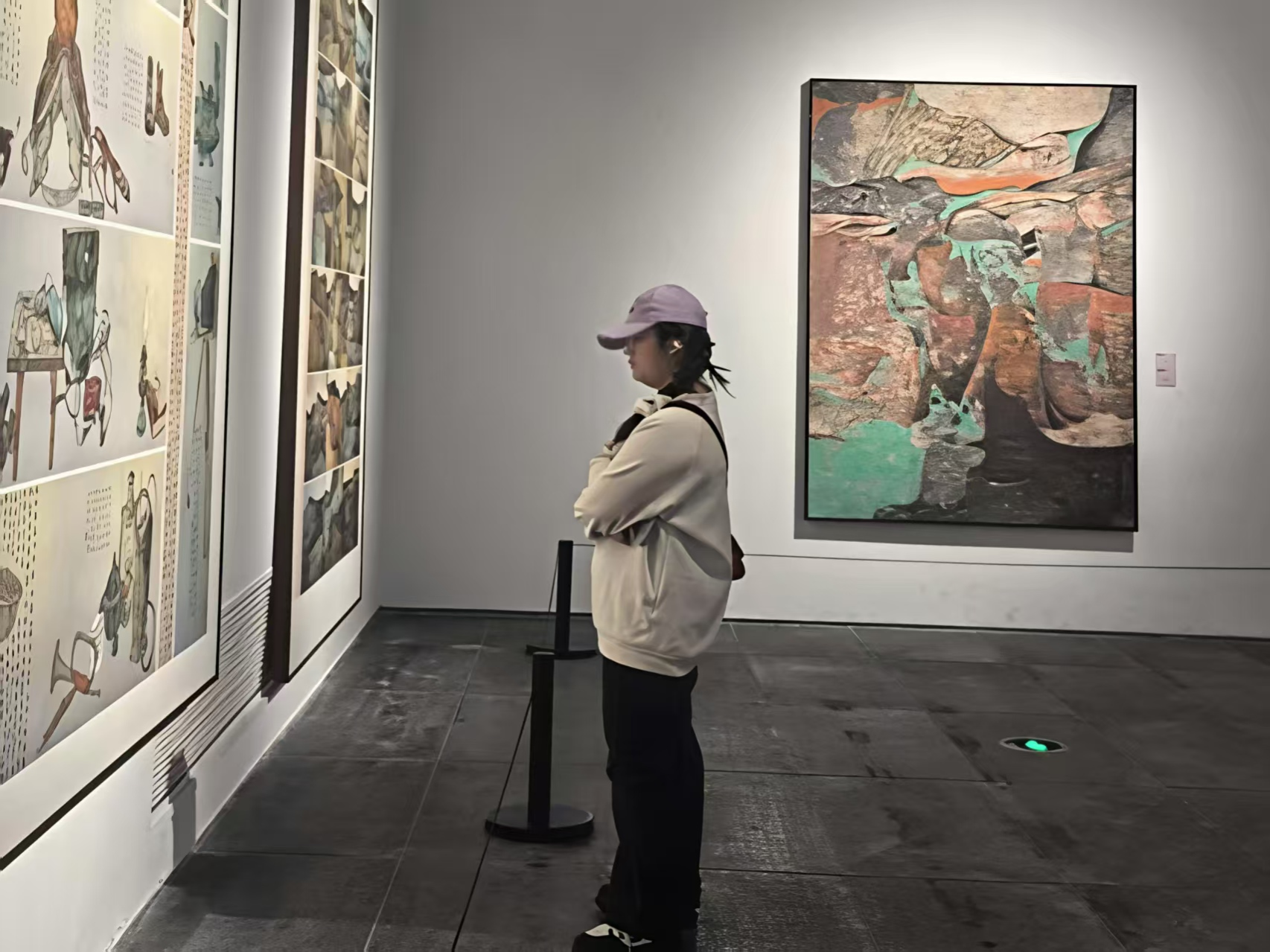 活动当日,同学们准时在湖南美术馆前集合,随后有序入场。活动期间,同学们依次参观了“湖湘百年美术之路”“湖南·中国画双年展”等核心展区。大家安静观摩着不同时期的代表性画作、雕塑及工艺美术品,并围绕作品的历史背景与艺术特点进行交流。部分同学结合自身专业方向,对经典作品进行多角度拍摄与文字记录,为后续课程作业积累素材。