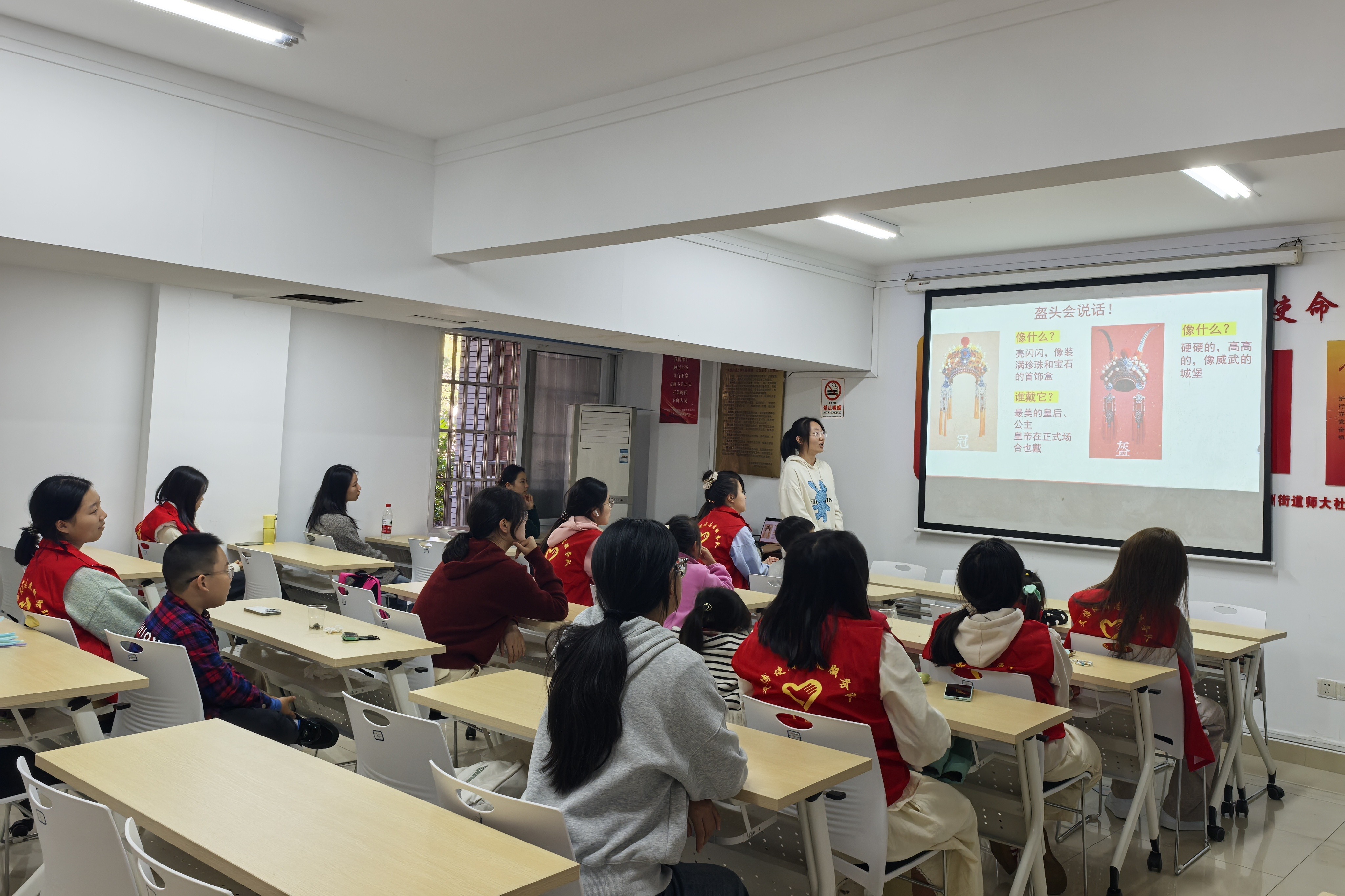 主讲人通过盔头图片展示引入主题。在知识讲解环节,主讲人结合视频与问答,系统介绍了盔头的发展脉络、主要分类与造型特征,阐释了其在京剧中“以形写意、以饰传神”的艺术功能。通过举办“人物竞猜赛”,引导小朋友们辨识不同造型、色彩与装饰所蕴含的等级制度、性格特征与命运隐喻,在观察与抢答中感悟中国传统礼制与美学内涵。小朋友们还通过观看《女将军觅盔头》视频,了解到盔头制作的核心工序与严谨技艺。此外,主讲人以京剧盔头为切入点,引导小朋友们联想湖湘非遗技艺,进而思考“非遗”的特点与意义,厚植非遗情怀。手工环节中,在志愿者的协助下,小朋友们发挥创意,亲手制作出各具特色的迷你盔头,并上台分享创作理念。活动结束后,志愿者们共同清扫活动现场,并与小朋友们合影留念。