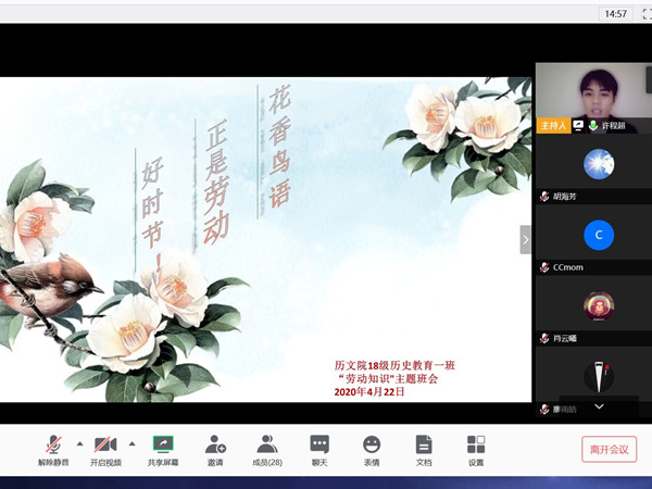 (通讯员 刘诗晨)为帮助员工树立良好的劳动观念,4月22日下午,2018级历教一班在腾讯会议上开展以“花香鸟语正是劳动好时节”为主题的班会。此次会议由2018级历教一班班长许程超主持,劳动委员胡海芳协助,2018级历教一班全体成员参加。