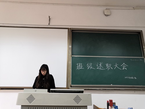 活动过程中,年级宣传委员姜隽姝、班长焦文瑶、班级团支书马一帆、班级组织委员陈金瑞、班级宣传委员舒家丽依次上台,对自己任职期间的各项工作进行了总结并作自我评价,表达了其在这一学年中任职员工干部的感受。同时,由班级成员对她们进行评分。