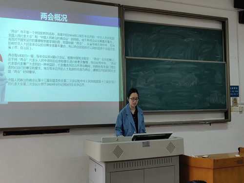 活动伊始,刘凌霄向大家介绍了“两会”的基本概况以及2019年两会召开的时间,并通过幻灯片与大家共同学习两会的主要内容和两会精神。随后,刘凌霄组织全体同学观看了两会相关视频材料,以进一步学习两会精神。