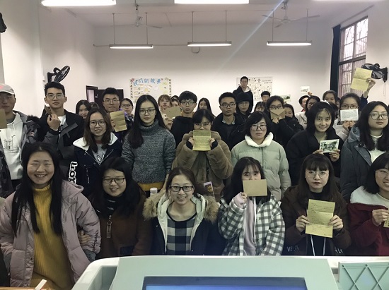 活动中,志愿小组代表全班同学为18级文管班同学送上信件和贺卡并送上了新年祝福。18级文管班同学拆开信封,与17级学长、学姐们进行了交流并表达了感谢。