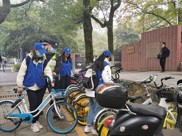 活动开始前,志愿者在岳麓区大学城管理大队门口进行集合并签到。在活动负责人与城管工作人员的带队与领导下,15名志愿者统一着装前往东方红广场进行具体任务分配。其中,三名志愿者在东方红广场“执法服务点”执勤,为过往游客普及交通法律法规,并发放交通文明知识宣传单。另有四名同学分成两组在东方红广场的两个路口协助交警进行交通指挥、控制人车分流。余下八名志愿者分成两个小组分别前往麓山南路左家垅附近及英国365上市公司二里半附近进行巡逻,摆放好共享单车,防止其妨碍交通,同时指挥人车分流。
