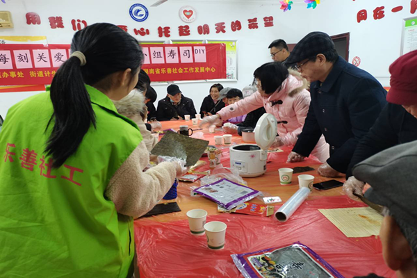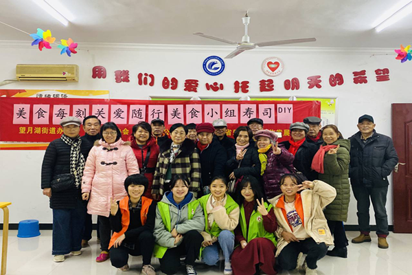 11月28日下午,志愿者们按6人一组分批参与第二板块“美食每刻·关爱随行”活动。由当地社区服务中心提供活动举办地点和所需食材,志愿者们负责组织开展热身游戏和帮助老人制作美食。活动过程中,志愿者与老人们陆续进行了你画我猜、合唱金曲和跳广场舞等游戏,并共同制作了寿司、奶茶等美食。