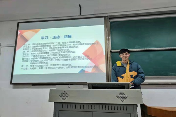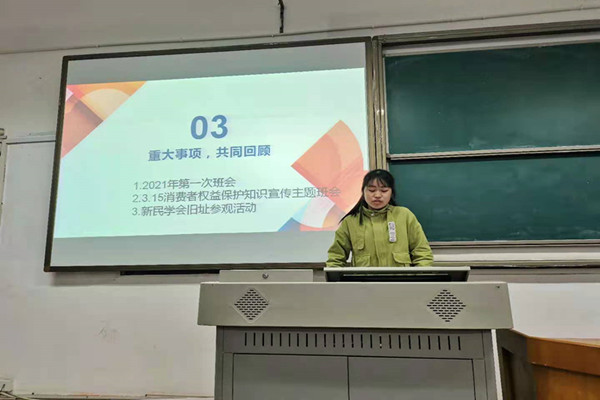 此次会议共有三项议程。会议第一项,由团支书带头,全体与会成员起立,共唱团歌。以此营造良好会议氛围。会议第二项,各班委依次对本月工作进行汇报总结,与同学们一起分享本月以来在学习、工作上的得失优劣,在交流中促进支部委员与成员之间的友谊,增进支部凝聚力。会议第三项,回顾三月中本支部发生的重大事件,包括支部大会暨第一次班会、3·15消费者权益知识宣讲主题班会以及参观新民学会旧址主题团日活动。