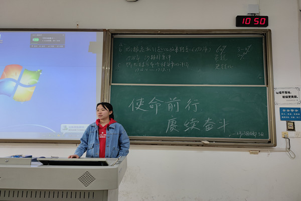 三月份的团日活动按照传统方式展开,团支书曾好以“不忘初心,牢记使命”为切入点,进一步阐述“为实现中华民族伟大复兴的中国梦不懈奋斗”的使命意义。活动过程中,曾好组织同学们观看了习近平主席重要讲话的视频,并带领同学们进行深入学习和了解。在观看视频后,同学们进行了讨论并阐述自己的感想。杨卉同学表示中国共产党一经成立就义无反顾肩负起实现中华民族伟大复兴的历史使命,就把坚持“人民利益高于一切”鲜明地写在自己的旗帜上,刘乐瑶同学也表示“我们生逢斯世,也要勇于担当,为自己,为亲人,为他人,为国家,为民族,勇敢地担负起自己应尽的责任,创造人生的精彩,书写生命的辉煌”。