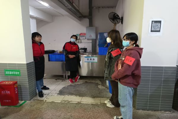 活动初始,刘心雨根据参加活动人数以及需要负责的场地范围对各项任务进行了安排与分工,同时对一些细节问题进行详细交代。班级志愿者根据分工安排进行志愿活动,第一组志愿者负责拍摄志愿者们为同学服务的照片;第二组志愿者检查进入食堂就餐成员的健康码并测量体温;第三组志愿者提醒同学规范用餐。同学们相互配合,积极完成相应志愿者的工作。