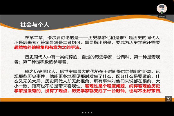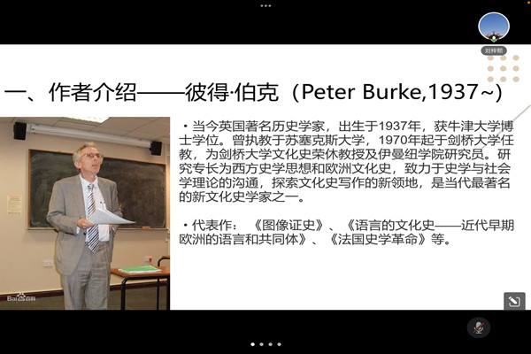 4月初,杨超在班会上布置了读书会的任务,同学们根据学号顺序分为四组,各自选取书目进行阅读。会议伊始,欧阳博爽对杨超老师表示欢迎,向各组组长表示感谢,并宣布读书会正式开始。第一组选择的是彼得·伯克的《图像证史》,刘梓熙从作者介绍、内容概况、经典图像分析、阅读心得四个部分进行分享,使同学们更加明确了图像对于历史研究的重要性;第二组阅读书目是爱德华·霍列特·卡尔的《历史是什么》,李露欣讲述了作者卡尔出色的史识与史才,对“历史”的种种侧面进行了分析,对历史与现实、历史与科学、历史的因果与规律等内容作出了精辟的论述;第三组阅读的是《史学理论读本》这本书,这是一本史学理论研究论文的精选,涵盖了历史学的基本性质和特征、史学研究的新思路、历史专门领域的拓展等诸多主题,刘广宇对小组成员的感悟进行了汇总与分享;第四组阅读的是福柯的《性经验史》,从史学界的观点看法、对史学的贡献与组员心得三个部分进行展示,杨贵钦分析了作者如何通过人类最本原的生命实践经验即“性经验”,来分析论证人类思想和文明史中“话语的权力构建”。各组分享结束后,杨超对于各组阅读的书目与分享进行点评,肯定了同学们在阅读过程中的收获与观点,并提出了相应的意见。