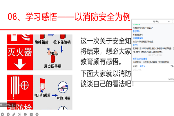 班会开始前,同学们准时提前进入班会,随后由唐婉开始主持。唐婉首先播放了一段主题PPT,其中通过展示消防安全演练的片段,使同学们了解到社会在发展,科学在进步,但人们的消防安全意识仍很淡薄,对火灾的麻痹和侥幸心理还普遍存在,借此教育同学们注意消防安全,不要心存侥幸。活动最后大家积极交流了对安全问题的看法,其中李鑫湘认为不能乱接电源,不违章使用电热器具、充电器等电器;刘官厅指出增强交通安全意识,步行时不要在马路上嬉戏打闹,尤其我们老员工骑自行车、电动车时要走非机动车道,不骑飞车,不抢行,不逆行,并以自身经历倡议骑电动车的同学尽快配备并戴好安全头盔等。最后唐婉总结发言,提出“安全在我心”的号召,号召每一位同学不仅要注意传统的交通、消防等安全,还要关注网络信息的安全,谨防网络诈骗。