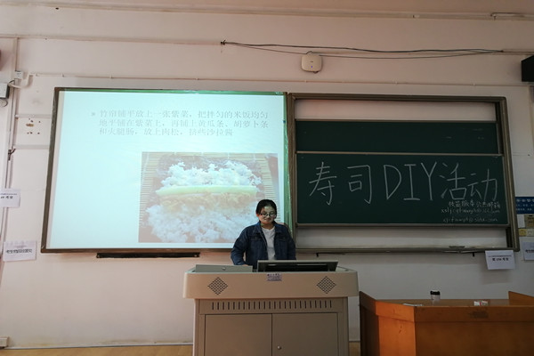 活动伊始,刘红播放幻灯片向会员们讲述了寿司的起源发展和寿司的制作方法,会员们认真听讲,初步了解了寿司的做法。随后,会员们着手DIY制作寿司,理事们在现场进行指导,帮助会员完成寿司的制作。活动后期,会员们互相分享制作好的寿司,相关理事对会员们的作品进行拍照留念。活动结束后,理事和项目组的成员一起打扫教室,理事们向项目组的成员表示了感谢。