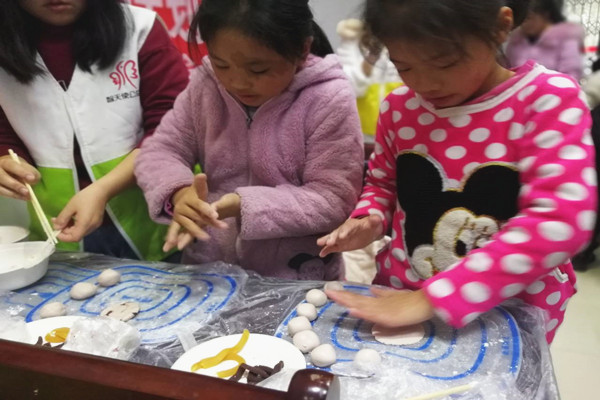 活动伊始,志愿者李棹通过播幻灯片向小朋友们介绍了小雪这一节气的含义及有关风俗习惯和相关概念,随后介绍了大概的活动步骤。讲解结束后,进入活动的制作环节,志愿者们在给小朋友们发放完制作雪团的材料后就开始陪同并引导小朋们开始制作雪团。制作过程中,志愿者帮小朋友们完成烧水和下锅及捞出等带有一定危险性的步骤。活动最后,小朋友们品尝并和志愿者们分享了自己动手制作的雪团。