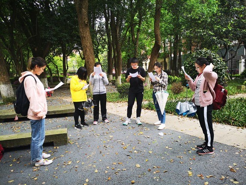 活动伊始,项目组成员提前集合进行赛前准备,俞何柯妮为全体参赛者讲解比赛规则。此次活动共分为“最强大脑”、“两人三足”、“过耳不忘”、“你比我猜”和“校碑签到”五个关卡,规定总体用时最短的队伍获胜。