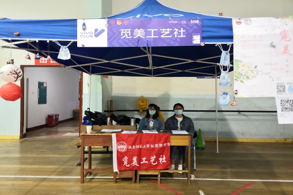 工艺社理事在活动开始前布置好展台,在展台上展示了社团成员制作的手工艺品,展现社团风采。报名正式开始前,理事们提醒前来报名的员工戴好口罩,保持间距有序排队。招新活动进行中,理事们积极引导会员进行线下报名和线上注册,维持会场秩序,确保招新工作顺利开展。招新结束后,理事们整理好所在展台,对场地进行清洁,并将桌椅等物品归还,最后合影留念。