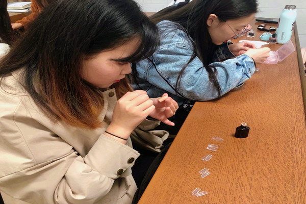 此次活动主题为“指尖艺术”,即利用美甲相关材料手工制作美甲。活动过程中,觅美社团理事首先对活动内容和相关工具的安全操作进行讲解,并给会员们分发美甲制作材料。美甲制作过程中会员们积极活跃,在保证安全的情况下利用甲油、甲片和各类饰品进行创作,手工制作出了各式各样新颖时尚的美甲,各色甲片经过烘烤完成制作。除了甲片的绘制,会员们也在指甲上直接进行创作,整个过程中教室的气氛也非常活跃融洽。