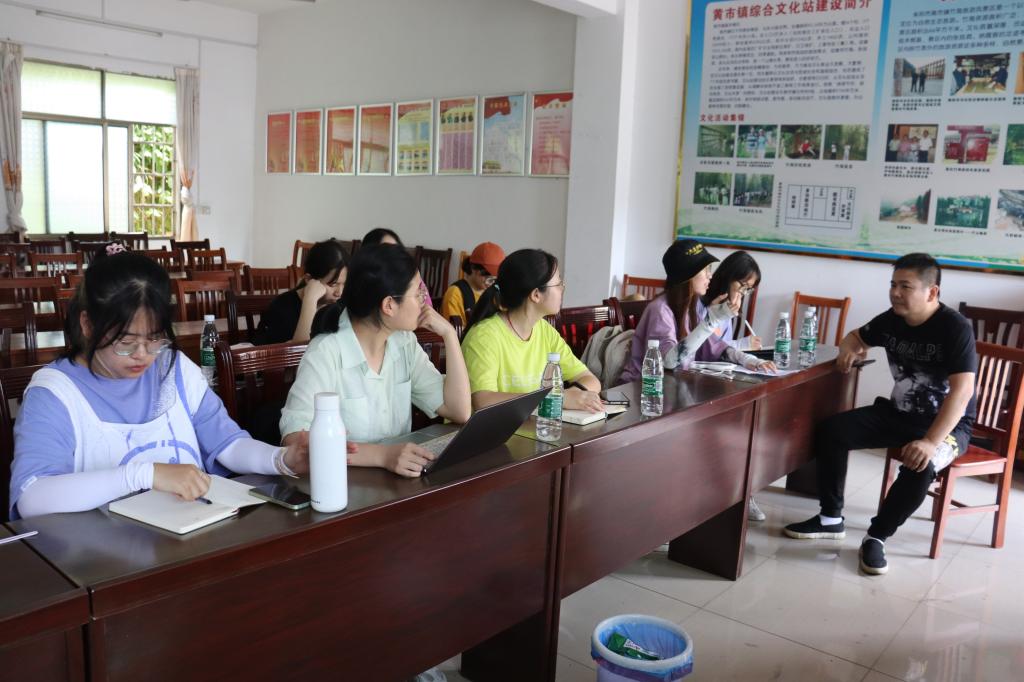 在午间经过了短暂的会议和商讨后,实践分队成员前往黄市镇黄市社区进行拜访。在说明了来意并对团队工作进行简要讲解后,黄市社区支书李冬成对实践队的调研工作表示鼎力支持,并通过PPT展示与讲解的方式向实践队介绍了黄市社区作为乡村振兴示范村的现状情况分析,和已经开展的政策措施与获得的成果,进一步对黄市社区经济扶贫后续工作以及未来的规划进行阐述。在实践队提出后续与黄市社区可能开展的合作活动,黄市社区负责人表示一定会尽力配合。