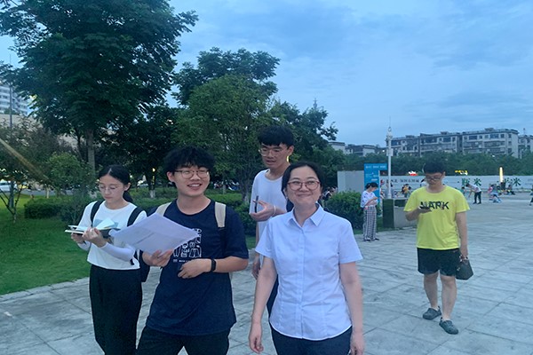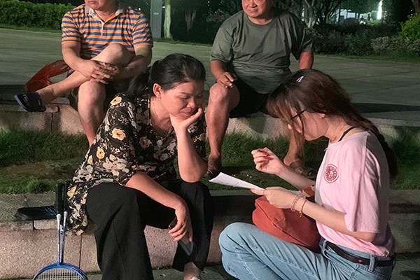 由口述史组组长籍月琴,组员王泽顺、宋子玉,实践组组员傅辰畅、刘燕文和宣传组组员万盈组成的小队率先来到了石门县体育馆文化广场放映点。该放映点位于人流量较大的城镇中心地带,夜间聚集了各个年龄阶段的居民前来观影和休闲娱乐,能为调研提供较多样本。在此期间,口述史组采访了六个观影群众,皆获得了授权签字。实践组共发放三十一份问卷,其中有效问卷二十八份,对当地的生活习惯和观影情况有了初步了解。不足的是,由于电影放映时间的局限性以及光线问题,队员们收集到的问卷数量较少。为了解决这个问题,实践组未来将会选择更多具有代表性的地点来充实样本数量,同时调整调研时间使采访取得更好的成效。