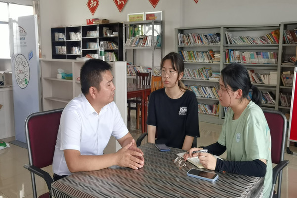 图为实践队员采访黄市社区支书李冬成