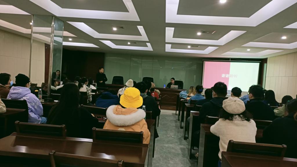 走出展厅,在岳麓书社的观景台感受过江景后,同学们在工作人员的带领下回到了二楼报告厅。市场部谢一帆为同学们做了“图书新媒体营销”主题讲座。讲座主要从2021年度市场分析入手向同学们具体讲述了出版发行的新变化、新情况,体现为“新客群、新渠道和新营销”。讲座还例举了许多优秀的营销案例,阐述了岳麓书社为适应市场变化做出的尝试。