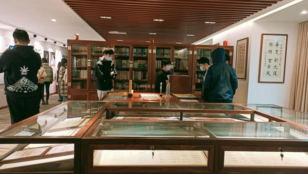 进门展墙上展示了岳麓书社从创社以来的历任社长及其带领岳麓书社革新发展所作的突出贡献。展墙以“开疆拓土”、“固本培元”、“折桂穿杨”等板块完整地体现了岳麓书社的历史沿革与发展历程。陈列室中央,展示着岳麓书社的部分精品典籍与历年来在图书出版领域所获证书。罗列众多,硕果丰盛。工作人员开放了古籍收藏室。讲解员借此讲述了出版社的特色、办社宗旨以及古籍整理工作,并重点介绍研究曾国藩的唐浩明老师。跟随着讲解员的脚步,同学们深入了解到岳麓书社的出版成就,也体会到古籍整理的不易。