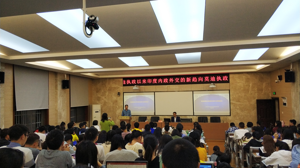 林延明副所长就“莫迪其人”、“印度政党政治的新变化”、“政治经济改革的新浪潮”、“印度对外关系的新动作”以及“印度的未来”这四个专题展开讲座。以印度总理莫迪的背景、政治经历、各党派之间的博弈、主流意识形态的变化、错综复杂关系的地方关系等,由浅到深地剖析印度的政治经济形势。依次讲解了印度政府出台的系列政治经济改革措施及其影响,印度的对各国外交的新动作以及与中国外交的大起大落。最后总结了印度迅速发展的历史进程及主要面临的挑战,对于印度未来的一个发展和未来的中印关系进行了深入的思考。讲座最后现场师生积极向林延明副所长提问,林延明副所长一一作出解答。