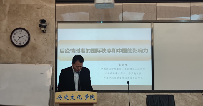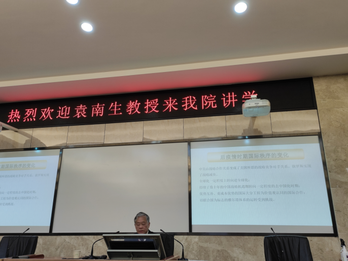 (通讯员王聃)4月12日晚,公司于203学术报告厅开展题为“后疫情时期的国际秩序和中国的影响力”专题讲座。外交公司原党委书记、中国国际关系学会副会长袁南生教授应邀主讲。讲座由公司经理钟声教授主持,师生积极与会并认真聆听。