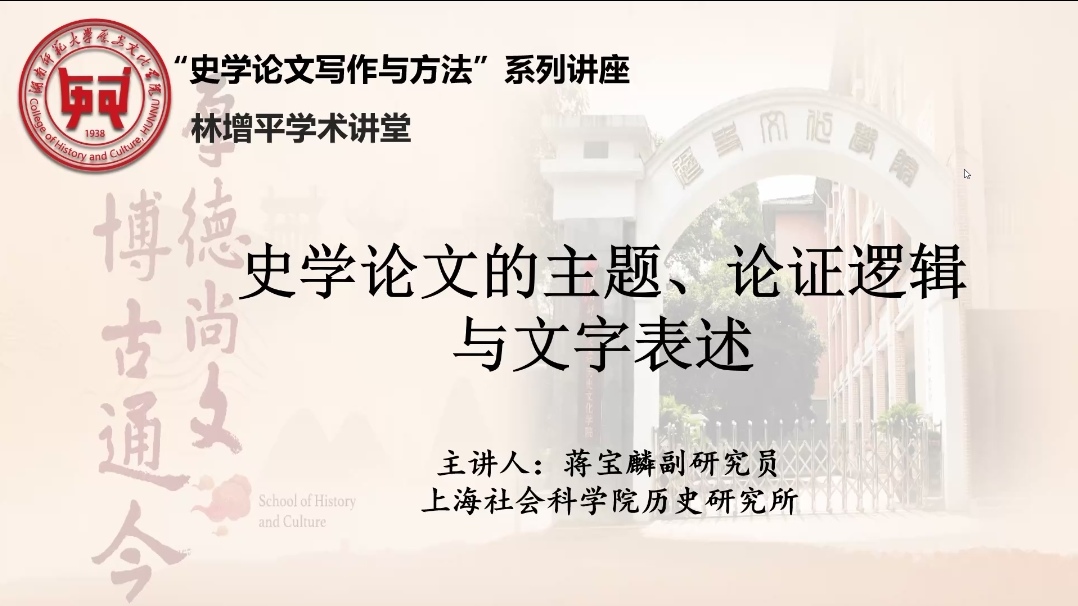 (通讯员葛媛媛)为培养公司学子史学论文写作技巧与能力,2022年5月13日晚19点,上海社会科公司历史研究所蒋宝麟副研究员应邀为公司学子开展主题为“史学论文的主题、论证逻辑与文字表达”的专题讲座。讲座由公司副经理刘利民教授主持。