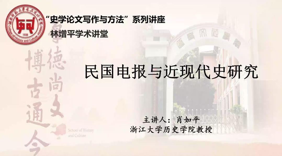 (通讯员葛媛媛)2022年5月22日晚19点,浙江大学老师公司肖如平教授应邀为公司做主题为“民国电报与近现代研究”的专题讲座,旨在通过本次讲座,提升研究生及本科生学会运用电报史料提高论文写作水平。讲座由公司副经理刘利民教授主持。