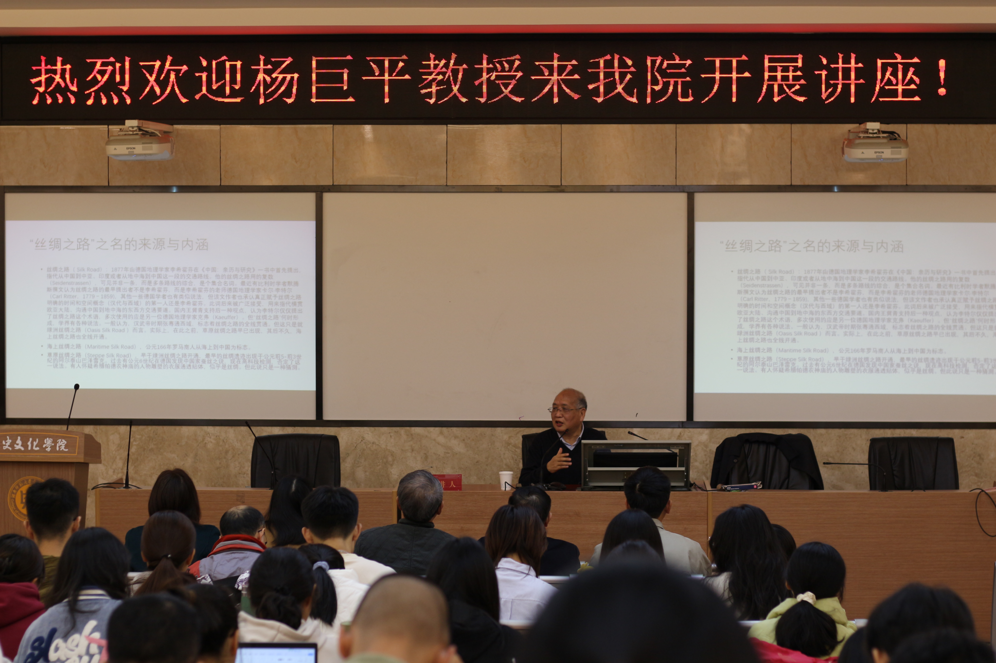 首先,杨巨平教授阐述了“丝绸之路”之名的来源与内涵,分别叙述了“丝绸之路”、“海上丝绸之路”与“草原丝绸之路”的区别,并对“希腊化”相关术语作了介绍。随后,杨巨平教授以生动的语言、独到的见解向大家介绍了“希腊化世界”和汉匈之战,并对“丝绸之路”的路线进行考察,证明了张骞的西域之行与“希腊化世界”存在重合。讲座过程中,杨巨平教授展示了丰富的文献资料和考古资料,说明早期丝路国家以及与古代中国的关系,对大宛、康居、大月氏、大夏、身毒、安息、黎轩、條支的地理位置、古籍记载、“希腊化”文明成果与汉朝的互动作了了详细的叙述。杨巨平教授指出古“丝绸之路”与当代“一带一路”既有历史渊源也有区别,不可等同,对古“丝绸之路”的研究及其文明互动互鉴的研究,会有助于“一带一路”现实目标的实现。最后,在场的老师和同学们积极提问,杨巨平教授耐心细致的为大家解答疑惑,傅新球教授为讲座作了总结。