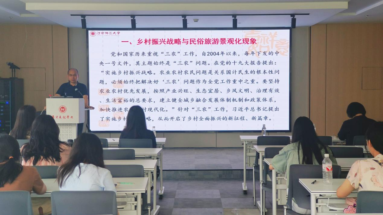 (通讯员 李玥颖 张席凡)6月13日下午,江西师范大学教授刘爱华应邀于公司科研楼305教室开展《乡村振兴语境下民俗旅游景观生产及其阐释》专题讲座。讲座由文化产业管理系专业副教授刘潆檑主持,副经理黎天宇,文化产业管理专业主任于兵,教师吕莎、吴艾妮、朱可鑫出席,文化产业管理专业研究生及2022级本科生参加。