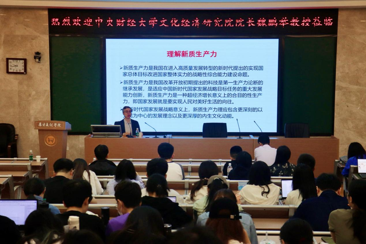 讲座伊始,魏鹏举教授指出,新质生产力是我国新时代高质量发展的核心引擎,其本质在于实现“人民对美好生活的向往”。他强调,文化作为内生动力与科技创新深度融合,将重构产业价值链条:“文化创意提升社会边际收益,科技创新降低经济边际成本”,二者协同催生新业态、新模式。魏教授援引习近平总书记对文化科技融合的系列论述,指出“加快发展新型文化业态”是推动文化产业增长的关键方向。