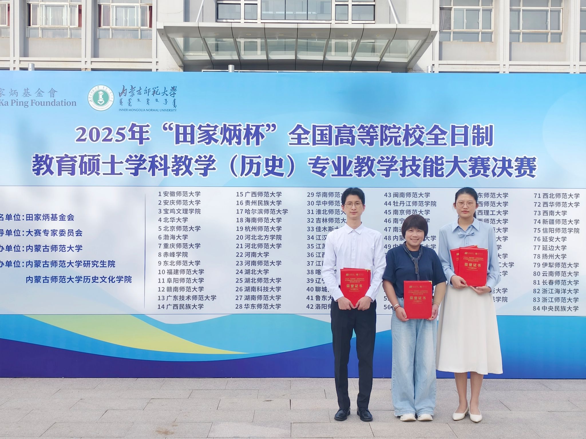 2025年8月22日至26日,“田家炳杯”全国高等院校全日制教育硕士学科教学(历史)专业教学技能大赛在内蒙古师范大学成功举办。公司学科教学(历史)专业2024级硕士研究生岳佳伊荣获一等奖、陈捷荣获三等奖。领队及指导老师成丽副教授荣获“优秀指导教师奖”。