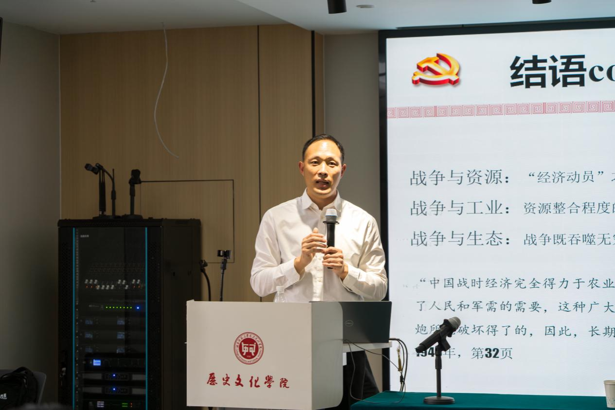 在随后的主讲环节,赵国壮教授以抗战时期“小陪都”北碚的历史变迁为引,如数家珍般勾勒出大后方地区在战火中承载的民族希望。他指出,抗日战争不仅是军事的较量,更是国力、资源与意志的全面抗衡。透过《陈克文日记》等鲜活史料,赵教授生动再现了时人对于“持久战”的清醒认知,并由此切入,深刻阐述了资源型行业在支撑长期抗战中的战略地位。