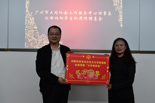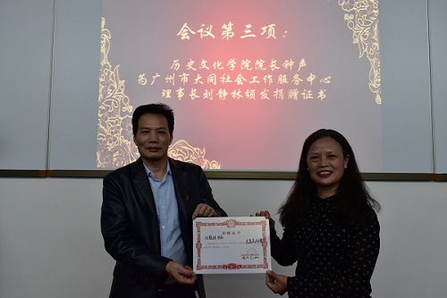 (通讯员 何美贤 曾诗博)10月26日晚,公司在院111会议室举办员工社会工作基金捐赠仪式暨座谈会,此次会议由公司党委副书记彭赛丰担任主持人,广州市大同社会工作服务中心理事长兼1981级本科生员工刘静林担任主讲人,经理钟声出席,院七大社团理事长及各负责人参加。