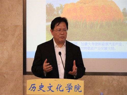 许国对能回到母校表示十分荣幸与感激,并说这源于他的母校情结和钟声真诚相邀。随后,许国详细地介绍了“氢的故事”。2015年,许国到了美国和加拿大,经考察后发现氢能作为一种新能源将会逐渐取代如今正在不断发展的纯电动性的燃料,于是便从战略高度决定在云浮发展氢能产业。而期间虽遭遇了诸多挑战,最终许国仍带领着团队取得了阶段性成效并顺利迎来了氢能发展新阶段。许国说“不疯狂不成魔”,正是其忘我投入的精神写照。