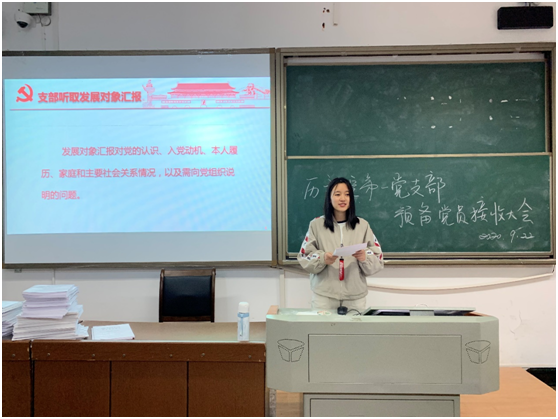 会议伊始,龚芯简要介绍了个人基本情况、学习工作现状、入党动机、对党的认识等问题,表达了自己加入党组织的决心。随后,其入党介绍人金楠娟、程顺就龚芯在培养考察期间的具体情况向与会党员作汇报,均表示愿意介绍其加入中国共产党,并希望龚芯同志再接再厉,争做合格党员。支部组织委员李倩倩代表支部委员会向大会作了审查情况报告,通过了接收龚芯转为预备党员的决议。在无记名投票中,龚芯共获得赞成19票,反对1票,符合党章规定及发展党员相关要求。