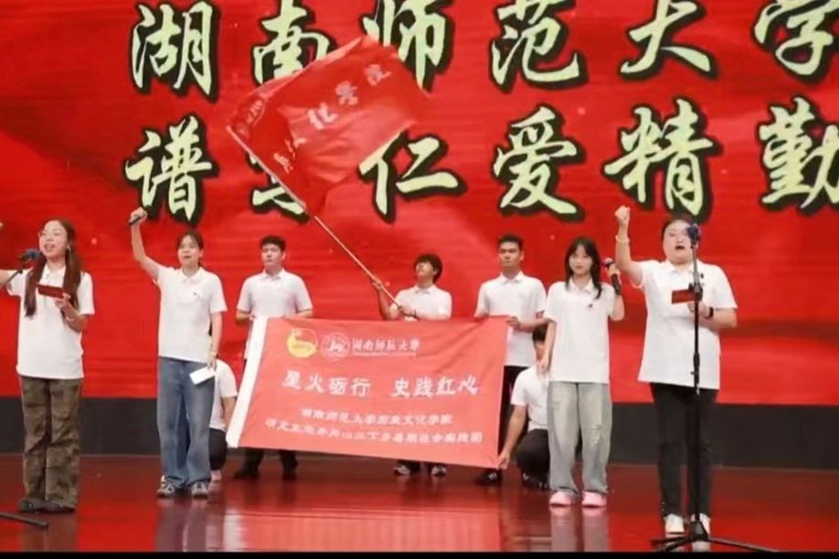 在开营仪式后的团队风采展示环节,各地高校纷纷亮出特色。湖南师大学子以一首饱含深情与力量的诗歌朗诵《薪火之路:星城到井冈》,展现了独属于师大人的昂扬精气神。