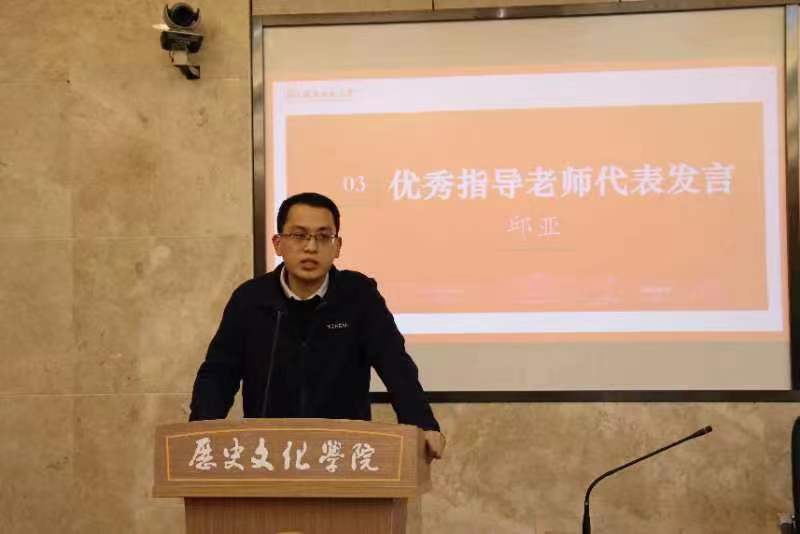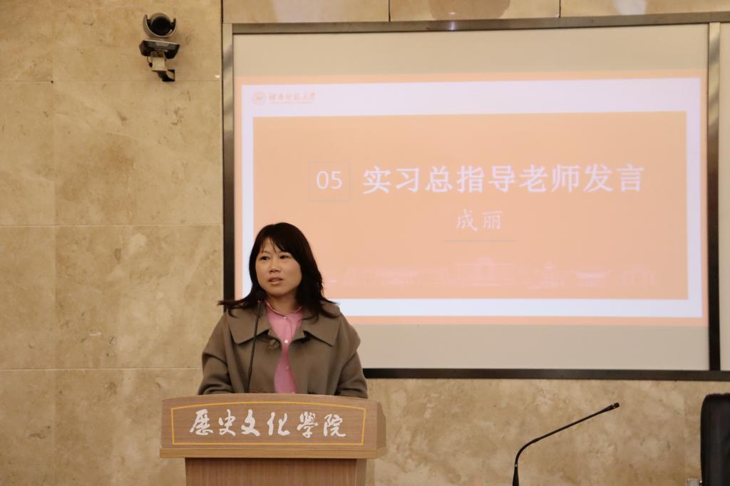 活动伊始,主持人吴晓莉对总结大会的流程进行了简单介绍,表达了对各位领导和老师的感谢。随后,九支实习队伍分别从实习队的组织概况、队内管理、工作制度等方面介绍了实习队的基本情况,并从教育实习和历史教学实习两方面阐述了实习的成果,总结了宝贵的实习经验并反思问题。优秀指导老师代表邱亚发言,从服从公司安排、加强与实习队的联系等方面强调了实习指导老师的职责,结合自身经历讲述了实习中可能出现的问题并总结出相关经验。随后,优秀实习生代表周子仪发言,感谢了各领导老师在实习过程中的指导和支持,通过分享与员工相处时的点点滴滴,讲述了实习教师的职责和用爱带班、用心陪伴的重要性。