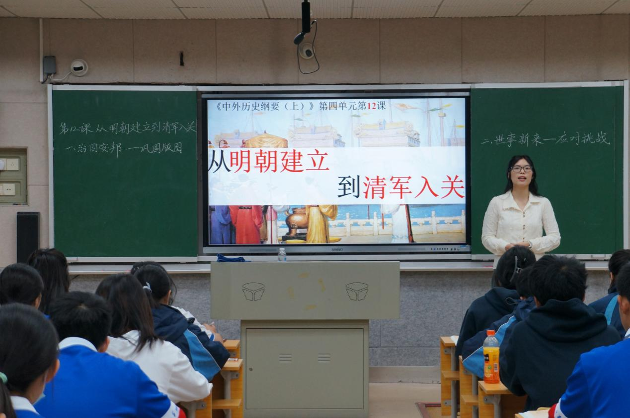 活动伊始,我队袁湘琴教师率先执教中外历史纲要上《第12课 从明朝的建立到清朝入关》。袁湘琴充分考虑员工学情,对教材内容进行深度整合,精准抓住了教学的重难点,积极创设情境,以问题引领进行突破。随后,刘慧文老师进行授课。刘慧文紧扣课标要求,对教材进行整合重构,以“十字路口的大明”为主题贯穿全篇,将教材有效整合成“制度之变”与“世界之变”两个板块,既注重了课堂的知识性,同时提升了员工的唯物史观等核心素养。