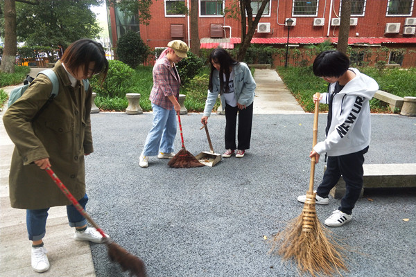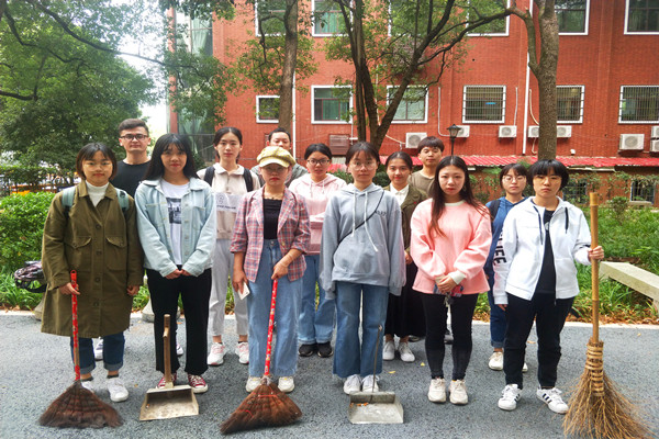 活动开始,小组成员准备好扫帚、灰斗等劳动工具,集体前往目的地樟园。在活动过程中,大家充分展现了不怕脏、不怕苦、不怕累的良好精神风貌,所有人都热情高涨,以劳动为荣。有的用扫帚清扫路面的落叶,有的忙着把路面的废纸团等杂物装进垃圾袋。短短一中午时间,樟园的环境就得到了彻底改善。活动最后,全体成员手持劳动工具进行合影留念。