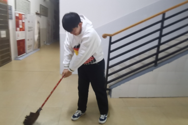活动前,小组成员于一楼三会办前集合,每位成员都提前准备好了扫帚拖把等卫生工具。傅钰儿对小组成员进行分工,每个人根据自己的任务进行劳动。劳动过程中,各位学员都表现得非常积极,吃苦耐劳,认真负责地共同协作完成劳动。活动最后,所有成员共同验收劳动成果。结束后,各位学员分享自己的心得体会,各位学员均表示,此次义务劳动让他们体会到了集体的力量,加强了党性修养,让他们深入理解了党的性质与宗旨,他们明白应该以实践的方式,去践行党的宗旨,从生活中的点滴小事做起,坚定理想信念,积极投身于建设社会主义伟大事业。